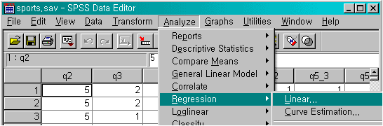 ¸Þ´º¿¡¼ [Analyze]->[Regression]->[Linear...]¸¦ ½ÇÇà½Ãŵ´Ï´Ù.