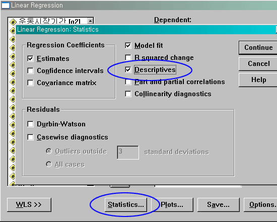 [Statistics...]¸¦ Ŭ¸¯ÇÏ¿© ¾Æ·¡±×¸²°ú °°ÀÌ ³ªÅ¸³ â¿¡¼ "Descriptives"¸¦ ¼±ÅÃÇØ ÁÝ´Ï´Ù.