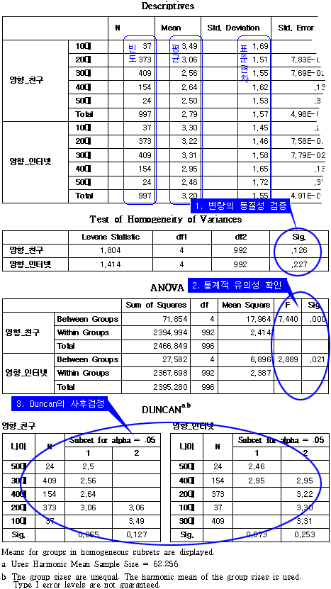 °¢ ¿¬·Éº° Áý´Ü°£ ¼ºÇâÀÇ Â÷À̸¦ ¾Ë¾Æº¸±â À§ÇÑ ´øÄÁÀÇ »çÈİËÁõ °á°ú Ä£±¸ÀÇ ¿µÇâÀº 20´ë¸¦ ±âÁ¡À¸·Î 10´ë¿Í 30~50´ë°¡ ¼·Î ´Ù¸¥ ¼ºÇâÀ¸·Î ºÐ·ùµÇ°í, ÀÎÅͳÝÀÇ ¿µÇâ¿¡ ´ëÇØ¼´Â 40´ë¸¦ ±âÁ¡À¸·Î 10~30´ë¿Í 50´ë°¡ ¼·Î ´Ù¸¥ ¼ºÇâÀ¸·Î ºÐ·ùµÇ´Â °ÍÀ¸·Î ³ªÅ¸³µ´Ù.