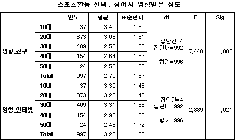 ½ºÆ÷Ã÷Ȱµ¿ ¼±ÅÃ, Âü¿©½Ã °¢ ¸Åü¿¡ ÀÇÇØ ¿µÇâ¹Þ´Â Á¤µµ°¡ ¿¬·É´ë º°·Î Â÷À̰¡ ÀÖ´ÂÁö¸¦ ¾Ë¾Æº¸±â À§ÇØ F-Åë°è·®À» ÀÌ¿ëÇÑ ÀÏ¿øºÐ»êºÐ¼®(One-Way ANOVA)À» ½Ç½ÃÇØ º» °á°ú´Â ¾Æ·¡¿Í °°´Ù.